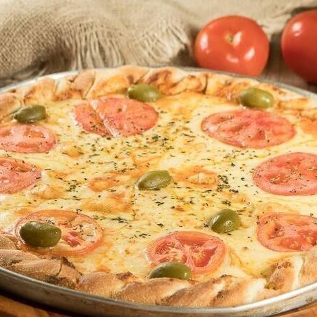 Pizza Grande (35cm) 8 Pedaços - Delicioso recheio de mussarela, tomate, molho de tomate, orégano e azeitonas.