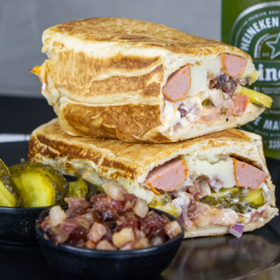 Pão 120g, purê de batatas cremoso, 1 salsicha sadia, bacon crispy, maionese, picles agridoce, cebola roxa, rodelas de tomate fresco, molho Billy & Jack e maionese de azeitonas