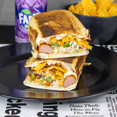 Boris Furioso (Pão, salsicha, maionese, ketchup, purê de batatas, pimentão verde, cebola roxa, cream cheese, pepperoni e doritos)
