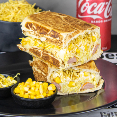 Pão, salsicha, maionese, purê de batatas, frango desfiado, catupiry, milho e batata palha