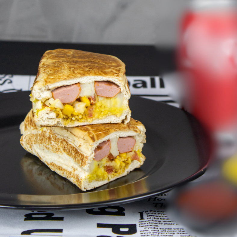 Pão, salsicha, maionese, bacon crispy, rúcula, mussarela e molho de mostarda e mel