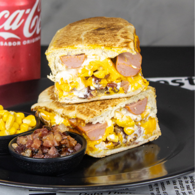Pão 120g, purê de batatas cremoso, 2 salsichas sadia, ketchup, maionese, mostarda, milho, bacon crispy, Catupiry batata palha, finalizado com nossa famosa crosta de queijo parmesão.