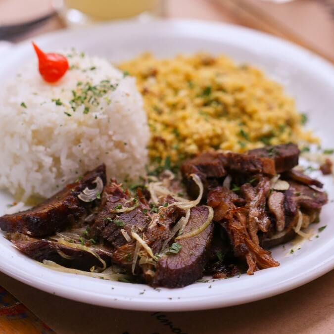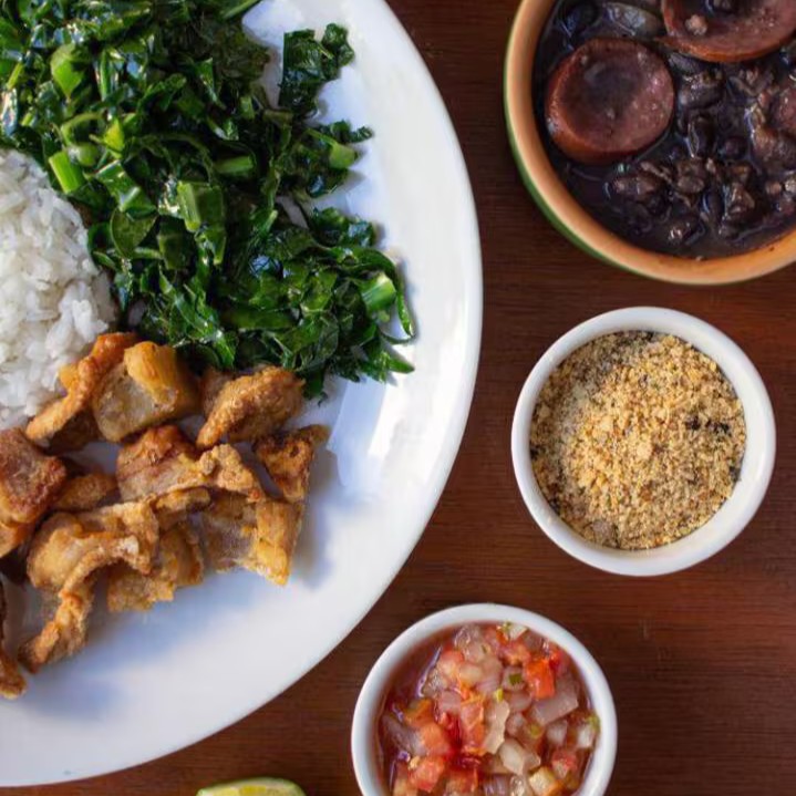 Feijoada com carne seca, calabresa, paio, bacon e costelinha defumada, servido com arroz branco, couve refogada, e vinagrete.