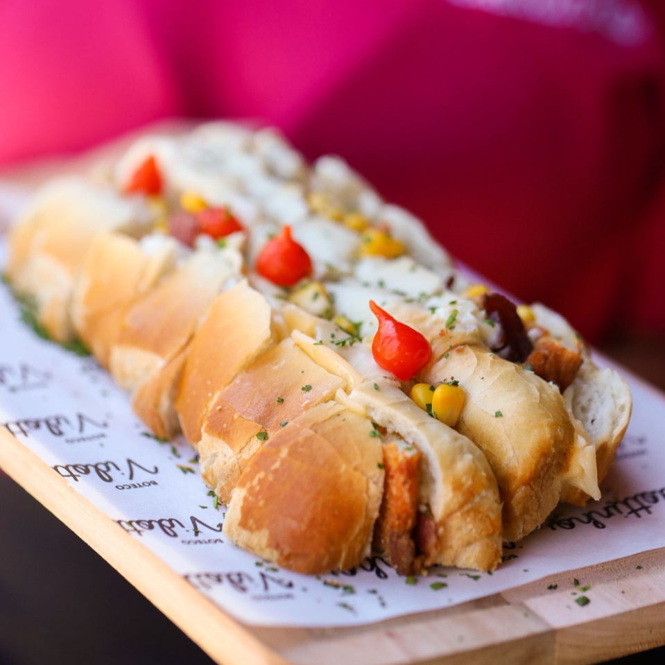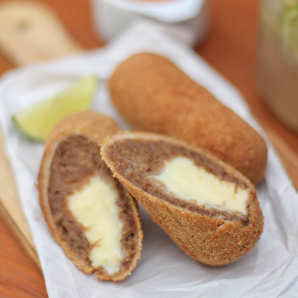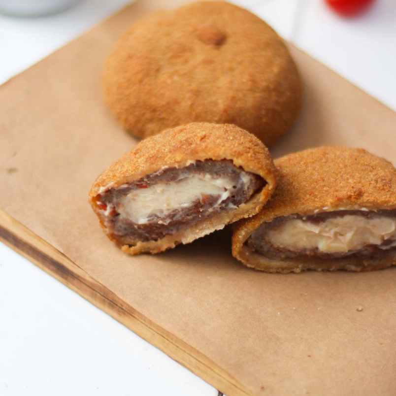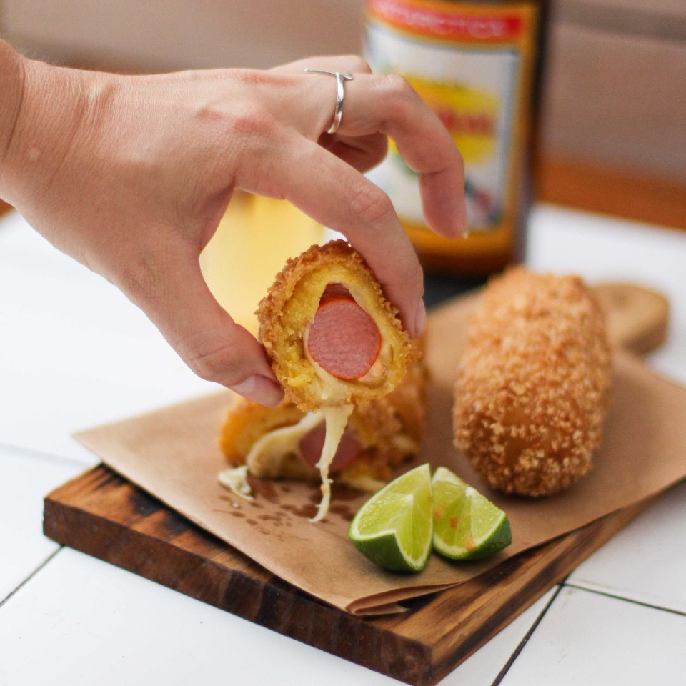 Salsicha empanada na Farinha Panko e nossa exclusiva massa de mandioca recheada com Mussarela!