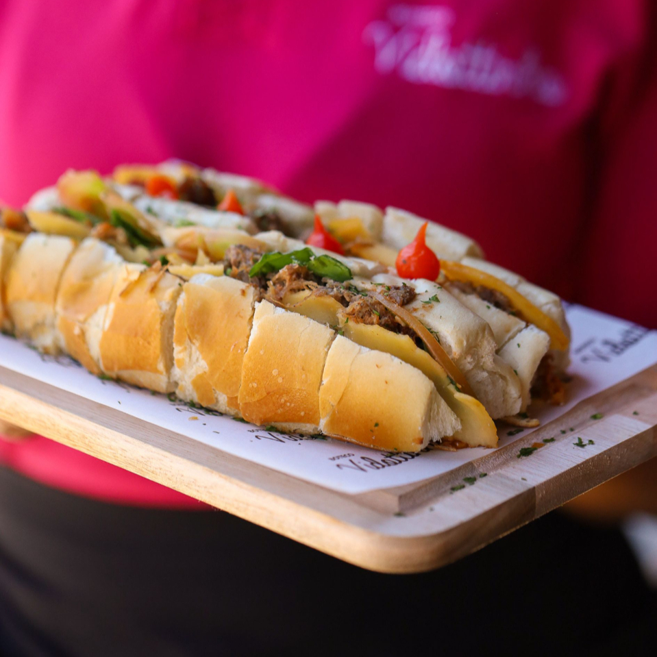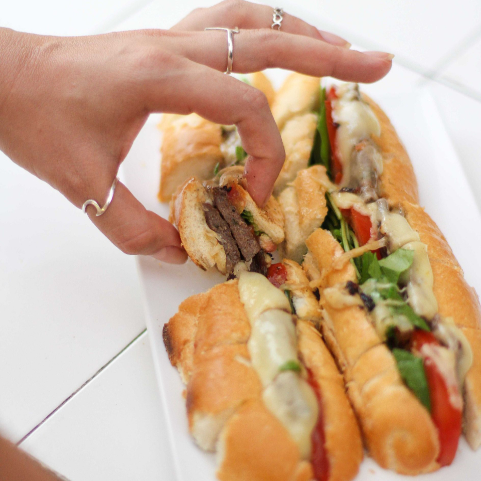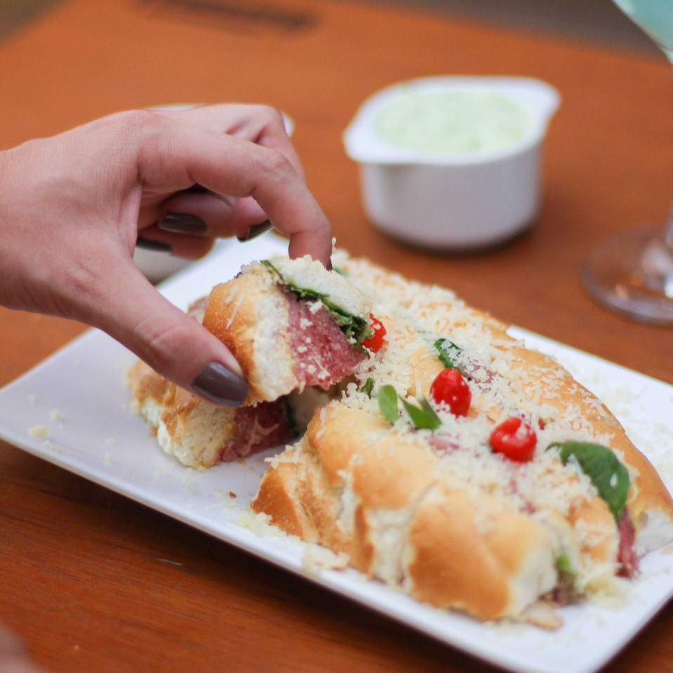 Rosbife Quente da Casa, Provolone, Azeitona Preta, Cebolete, maionese da Casa e Parmesão Ralado