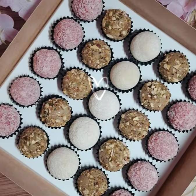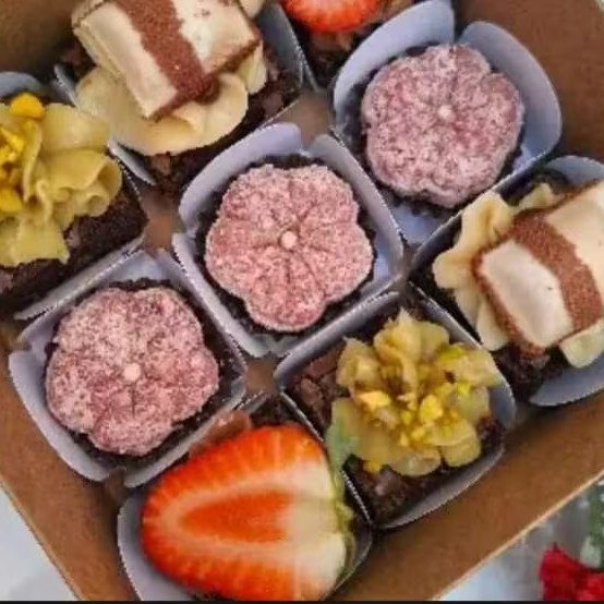 São 06 mini brownies (02 Kinder, 02 brigaeiros com morango e 02 pistache) e 03 brigadeiros de Ninho formato flor