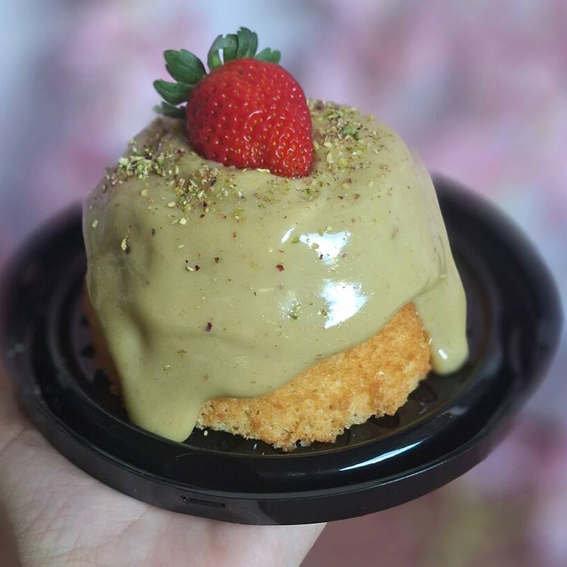 Pão de ló de baunilha, coberto com brigadeiro cremoso de pistache, salpicado de pistache in natura