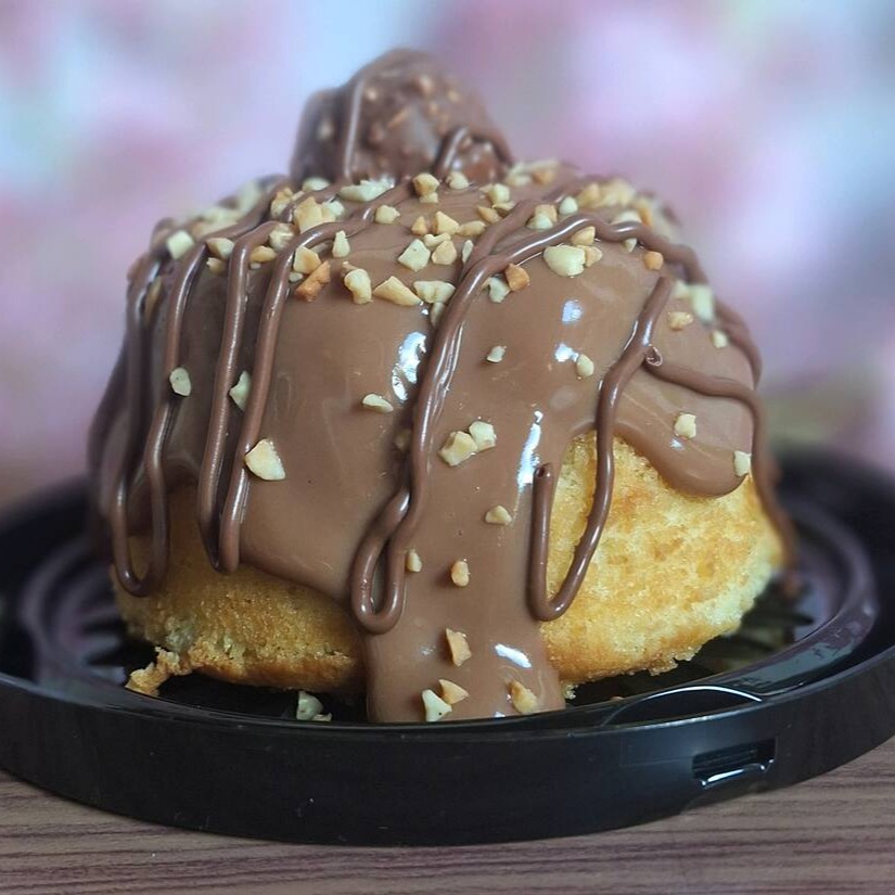 Pão de ló de baunilha, coberto com brigadeiro ao leite, Nutella, amendoim, finalizado com bombom ferrero rocher