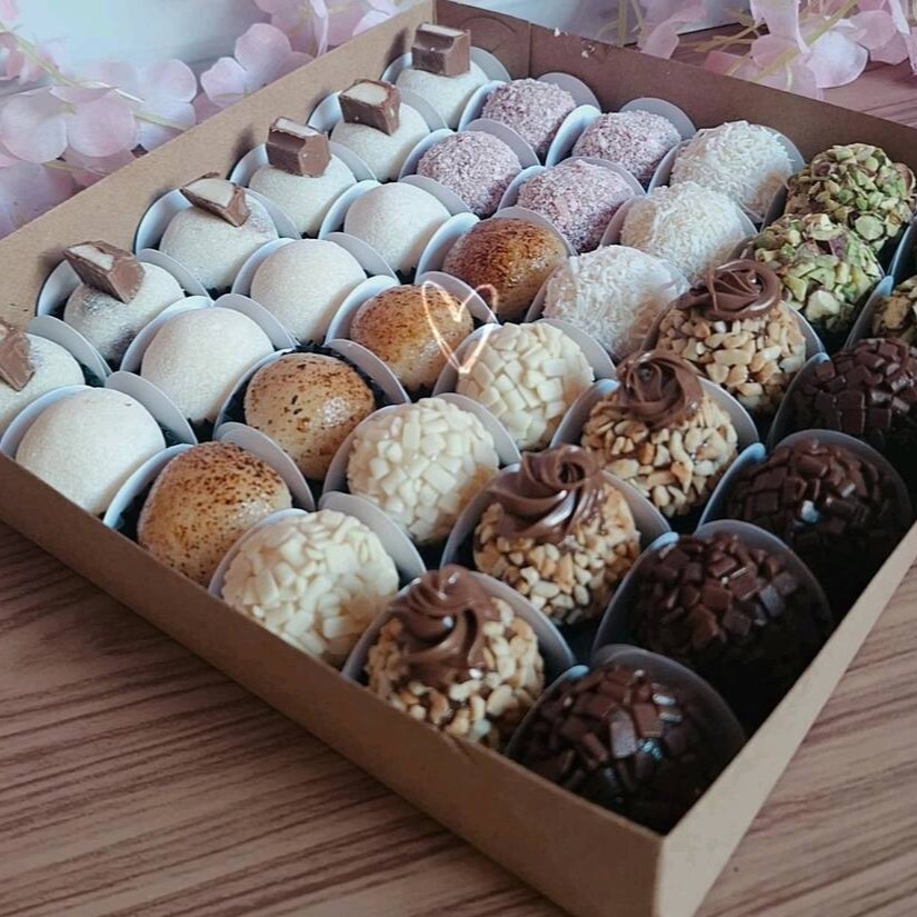 Brownie em cubos, brigadeiro ao leite, brigadeiro de Ninho, fruta a sua escolha