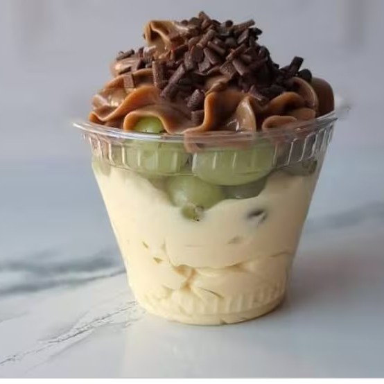 Brigadeiro de Ninho cremoso, uva verde, brigadeiro cremoso, finalizado com granule ao leite