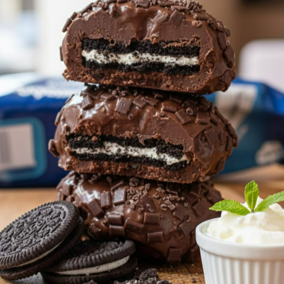 brigadeiro ao leite recheado de oreo, finalizado com granule ao leite