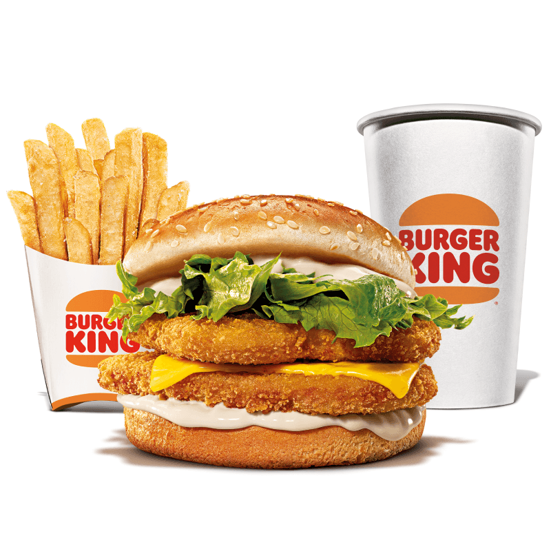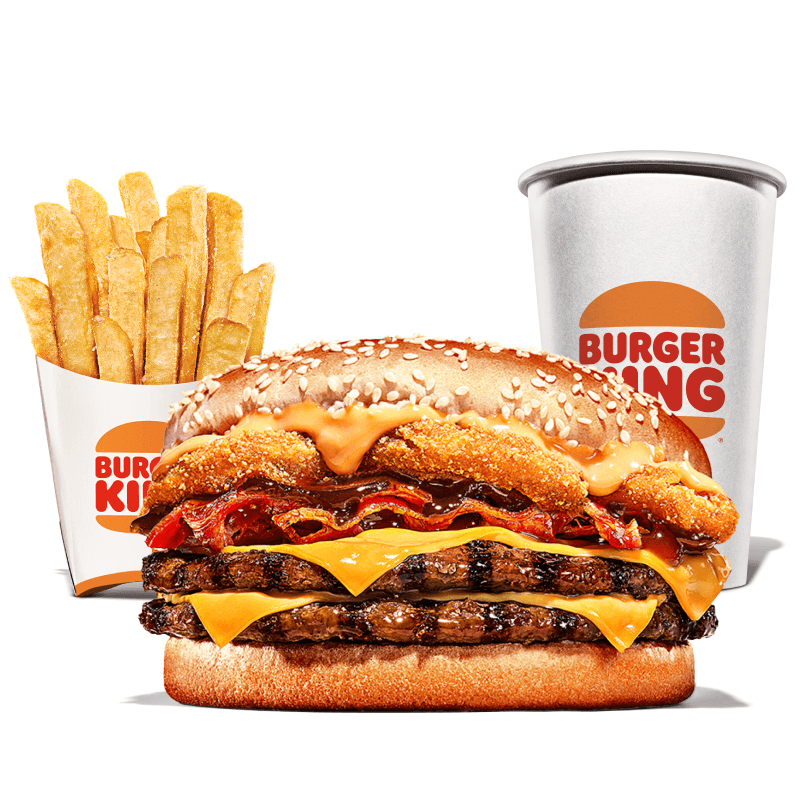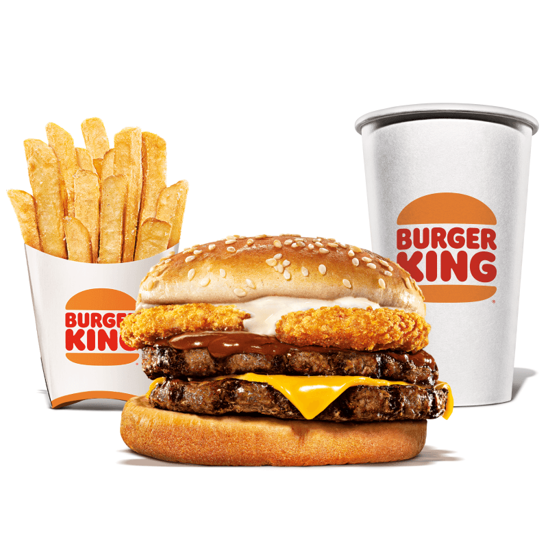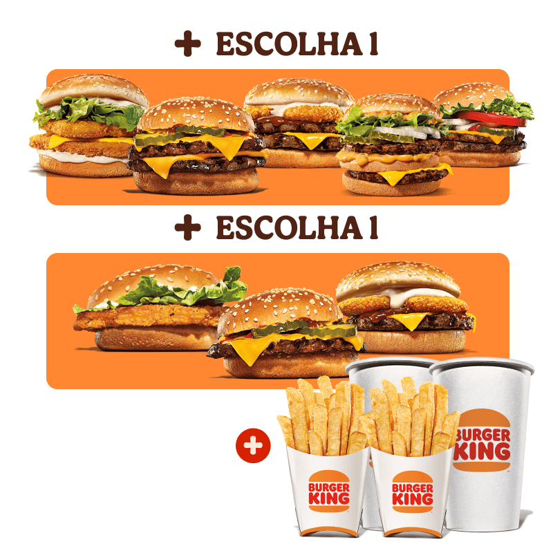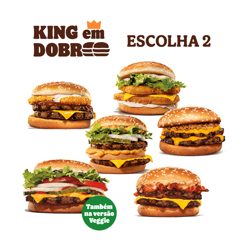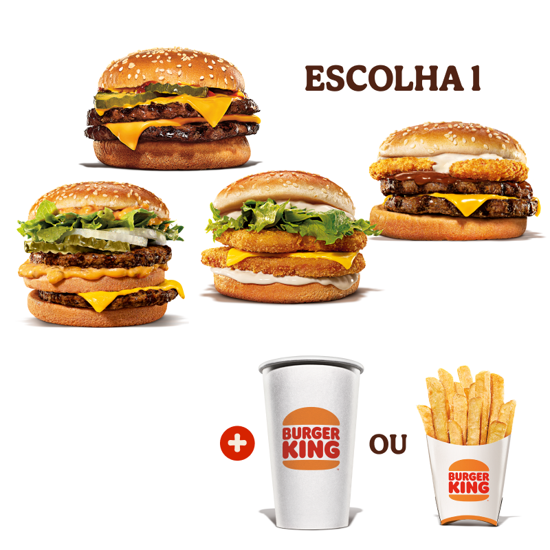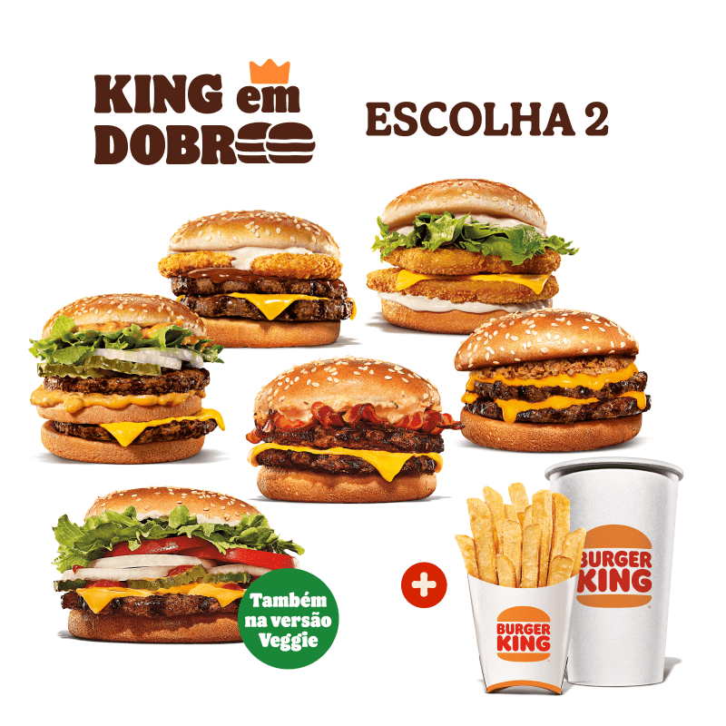 Selecione seu sanduíche favorito: Chicken Duplo, Cheeseburger Duplo, Rodeio Duplo, Big King ou Whopper Duplo Jr. Complemente com 1 batata frita ou 1 bebida.