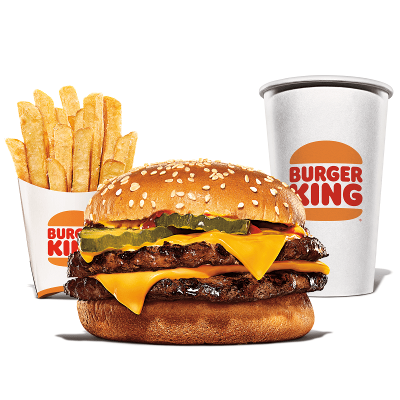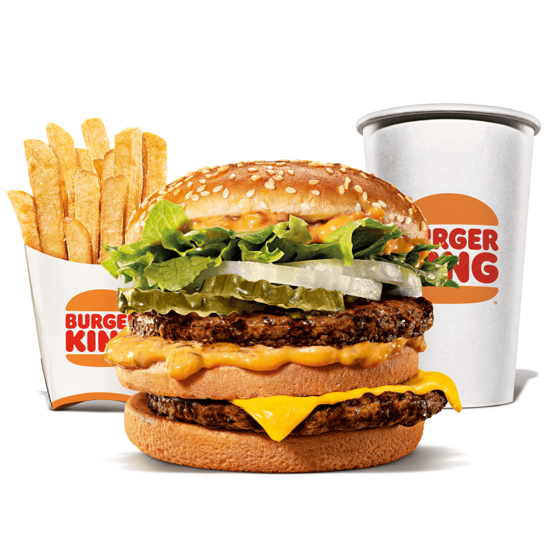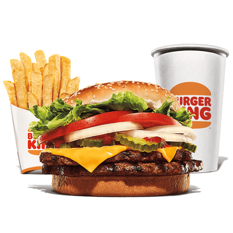 Um hambúrguer com duas carnes bovinas grelhadas de 113g, pão com gergelim, queijo derretido, picles, salada fresca (alface, cebola, tomate), ketchup e maionese bk. Acompanha batata frita e bebida.
