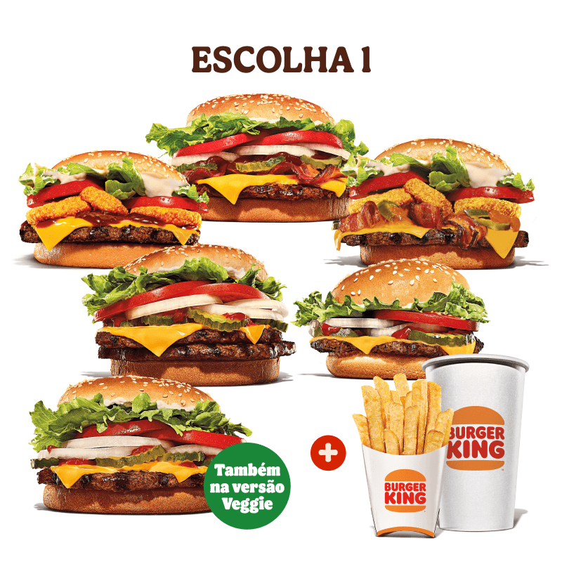 Escolha 1 sanduíche entre Whopper, Whopper Vegetariano, Whopper Duplo, Whopper Furioso, Whopper Rodeio, Whopper Barbecue Bacon ou Whopper Junior + 1 Batata + 1 Bebida