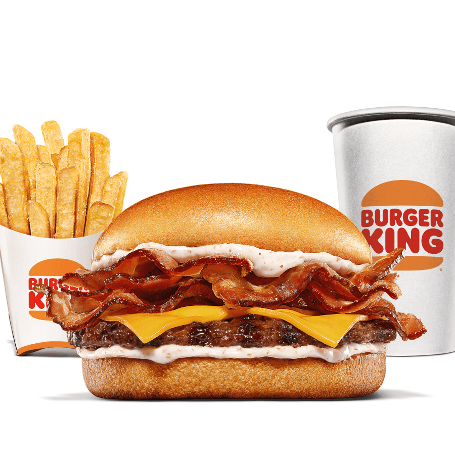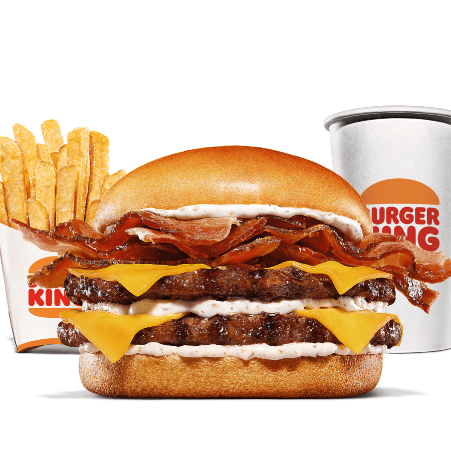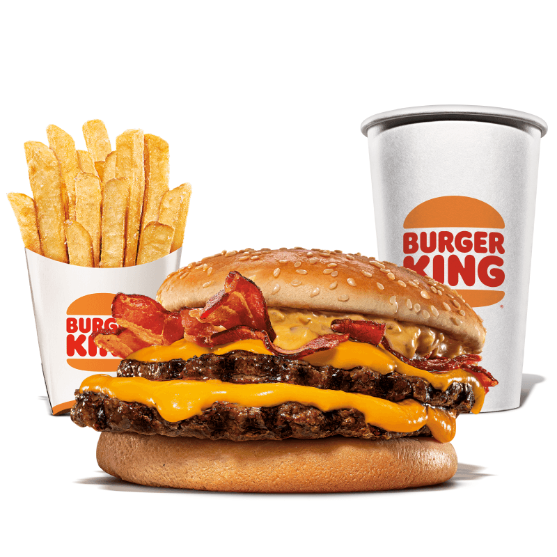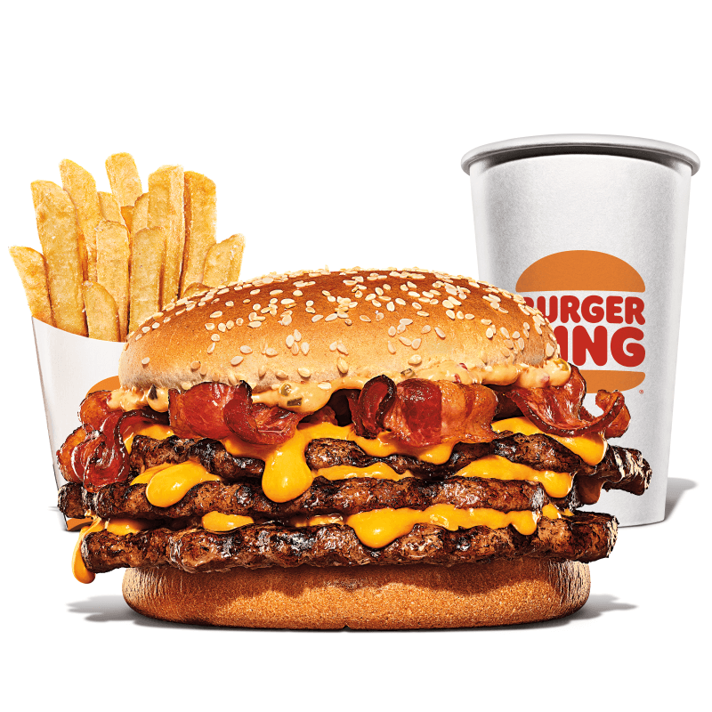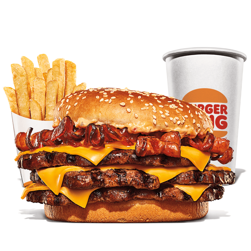 Um hambúrguer com três carnes bovinas grelhadas de 113g, pão com gergelim, queijo derretido, fatias de bacon crocante e o exclusivo molho bk stacker. Acompanha batata frita e bebida.