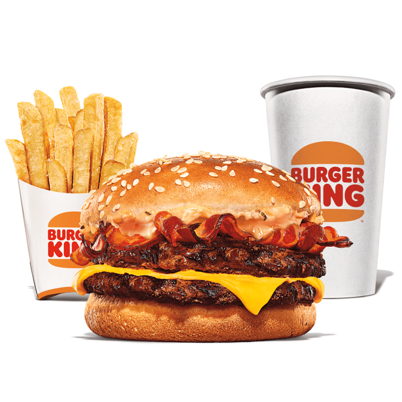 Um hambúrguer com duas carnes bovinas grelhadas de 113g, pão com gergelim, queijo derretido, fatias de bacon crocante e o exclusivo molho bk stacker. Acompanha batata frita e bebida.