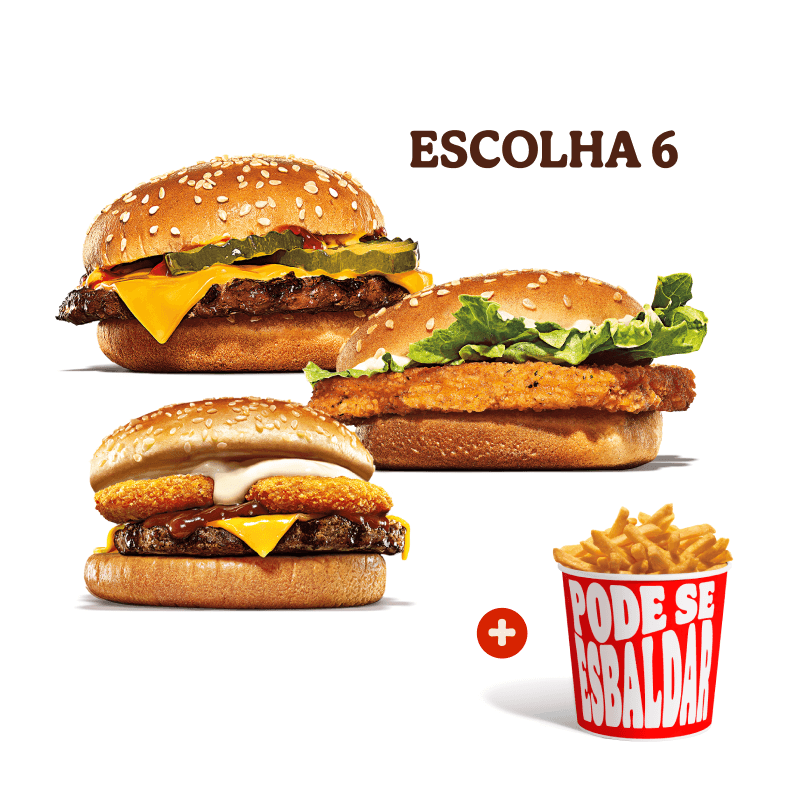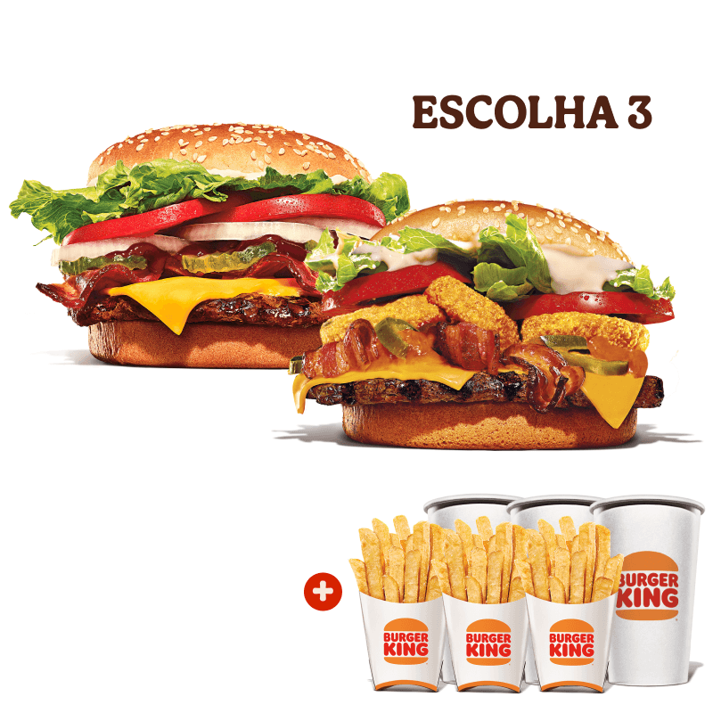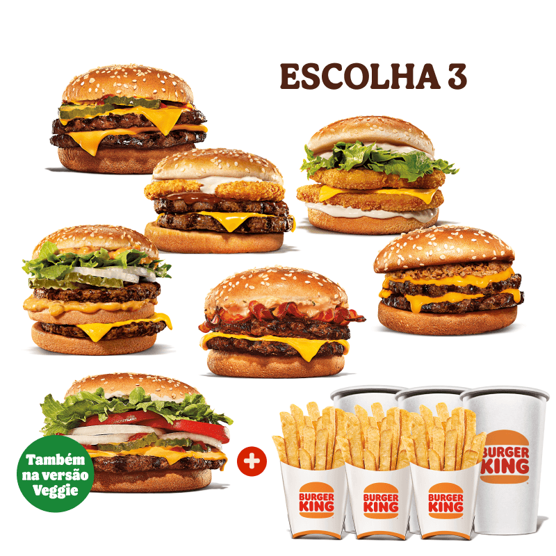 3 sanduíches (Escolha um Sanduíche entre: Whopper, Chicken Duplo, Rodeio Duplo, Big King, Whopper de plantas, Stacker Duplo e Cheeseburger Duplo.) + 3 Batatas Fritas + 3 Bebidas.