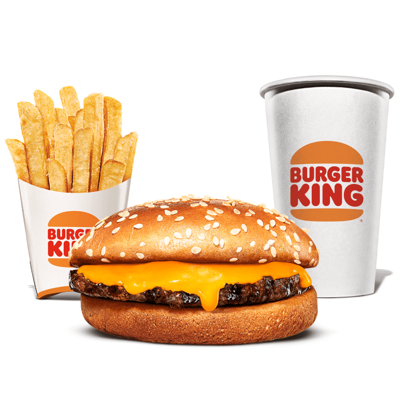 Um hambúrguer de carne bovina grelhado de 113g, pão com gergelim, queijo derretido, picles, salada fresca (alface, cebola, tomate), ketchup e maionese bk. Acompanha batata frita e bebida.