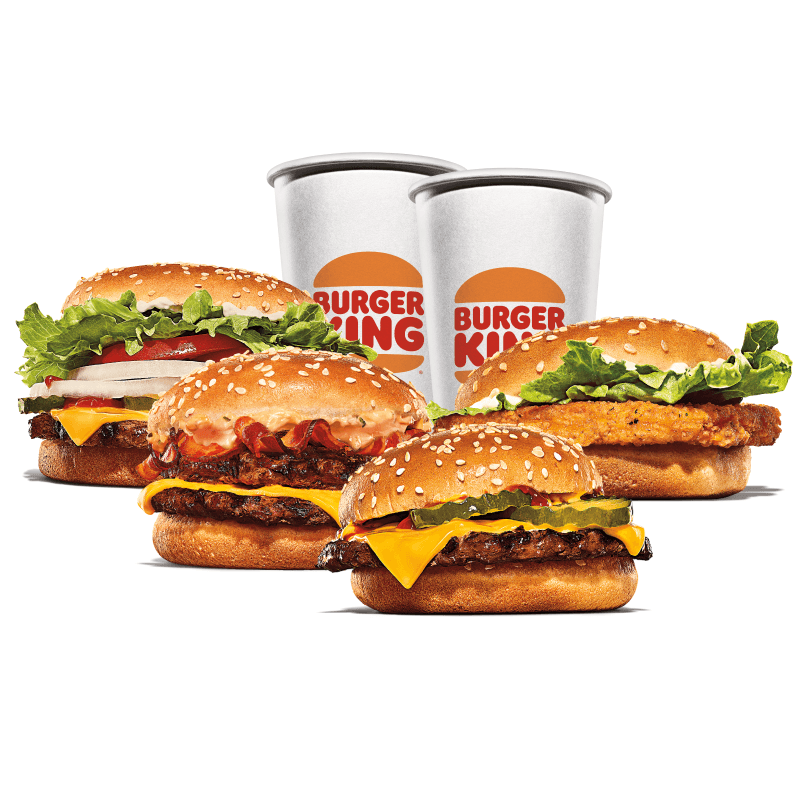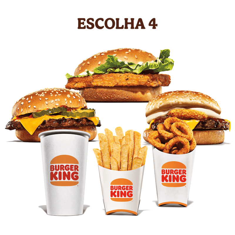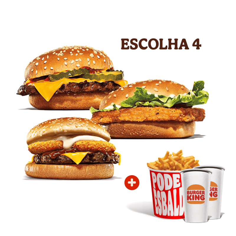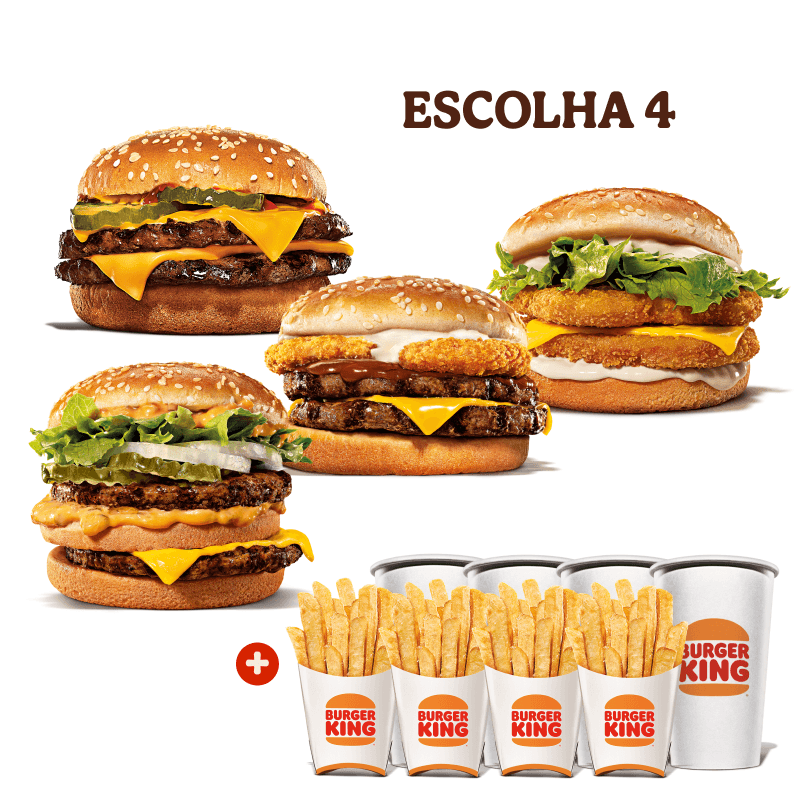 Escolha 4 sanduiches favoritos para formar o seu combo: Chicken Duplo, Cheeseburger Duplo, Rodeio Duplo, Big King ou Whopper Duplo Jr.