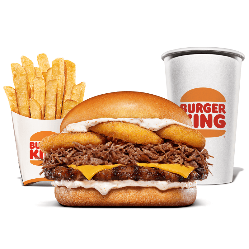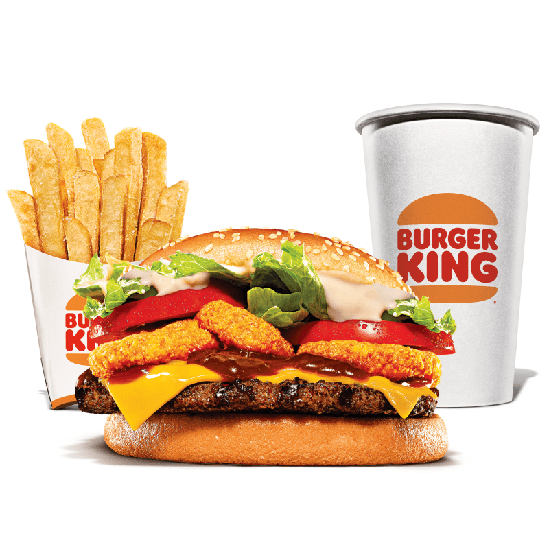 Um hambúrguer com uma carne bovina grelhada de 113g, pão com gergelim, queijo derretido, molho barbecue, salada fresca (alface, cebola e tomate), bacon fatiado, picles e maionese Bk. Acompanha batata frita média e bebida.