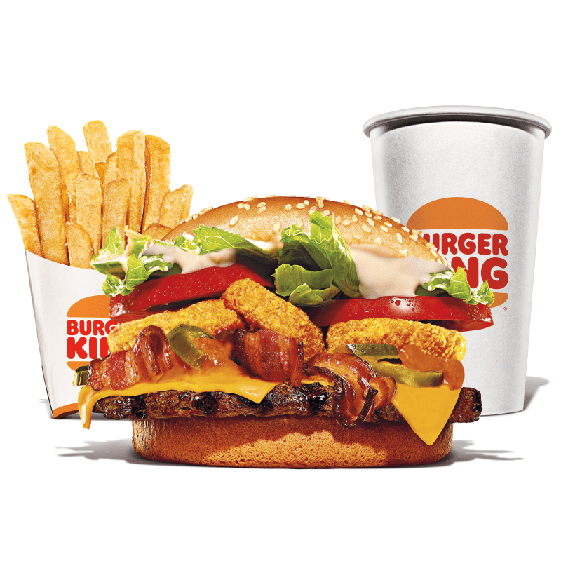 Um hambúrguer de carne bovina grelhado de 113g, pão com gergelim, queijo derretido, onion rings , fatias de bacon crocante, pimenta-jalapeño, salada fresca (alface e tomate), o exclusivo molho furioso e maionese bk. Acompanha batata frita e bebida.
