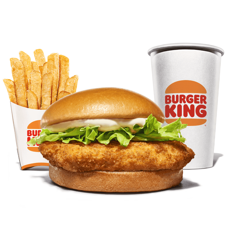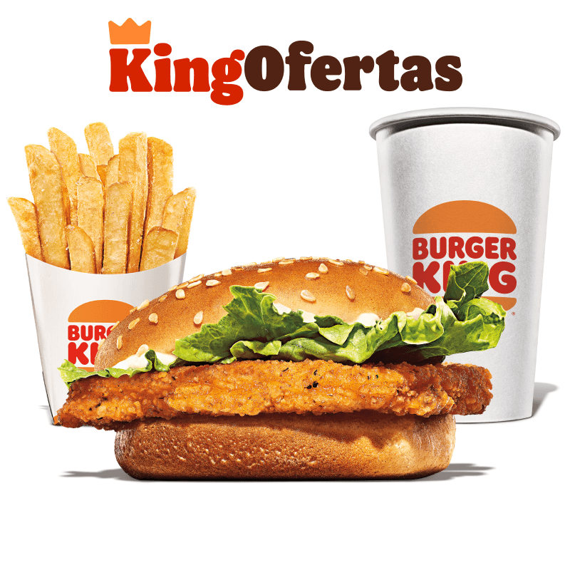 1 frango crocante, salada fresca (alface) e maionese Bk. Acompanha batata frita e bebida.