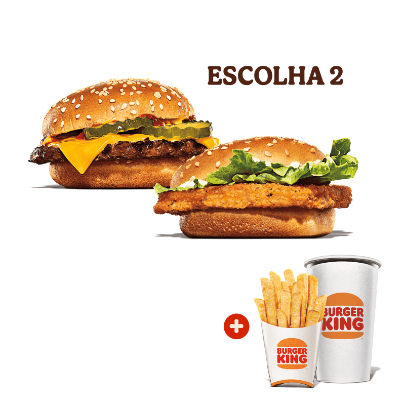 Escolha dois sanduíches entre: Whopper, Big King, Rodeio Dp, Cheeseburger Dp, Cheddar Dp, Chicken Dp, e Stacker Duplo. + 1 Acompanhamento + 1 Bebida.