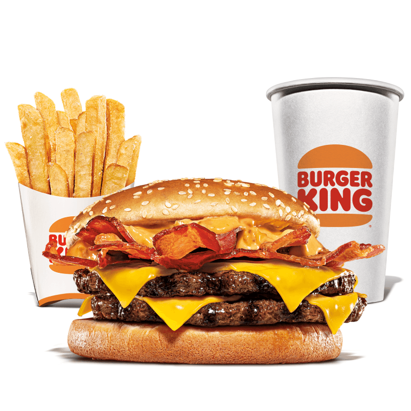 Um hambúrguer com duas carnes bovinas grelhadas de 57g, pão com gergelim, queijo derretido, fatias de bacon crocante e o exclusivo molho bk stacker. Acompanha batata frita e bebida.