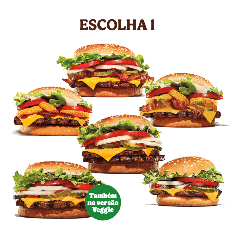 Escolha 1 sanduíche entre Whopper, Whopper Vegetariano, Whopper Duplo, Whopper Furioso, Whopper Rodeio, Whopper Barbecue Bacon ou Whopper Junior