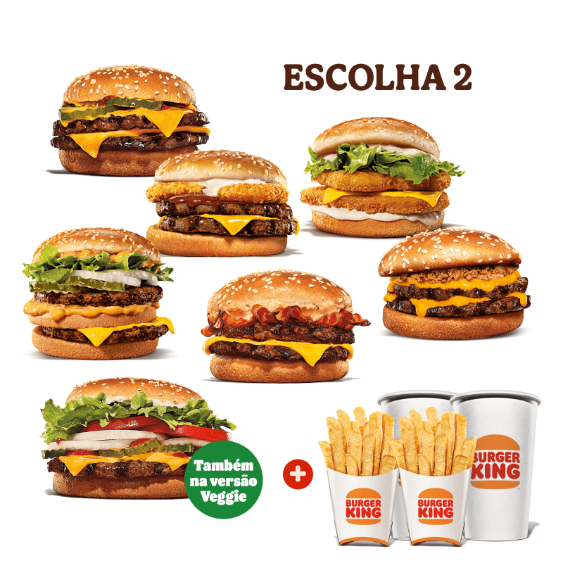2 sanduíches (Escolha um Sanduíche entre: Whopper, Chicken Duplo, Rodeio Duplo, Big King, Whopper de plantas, Stacker Duplo e Cheeseburger Duplo) +