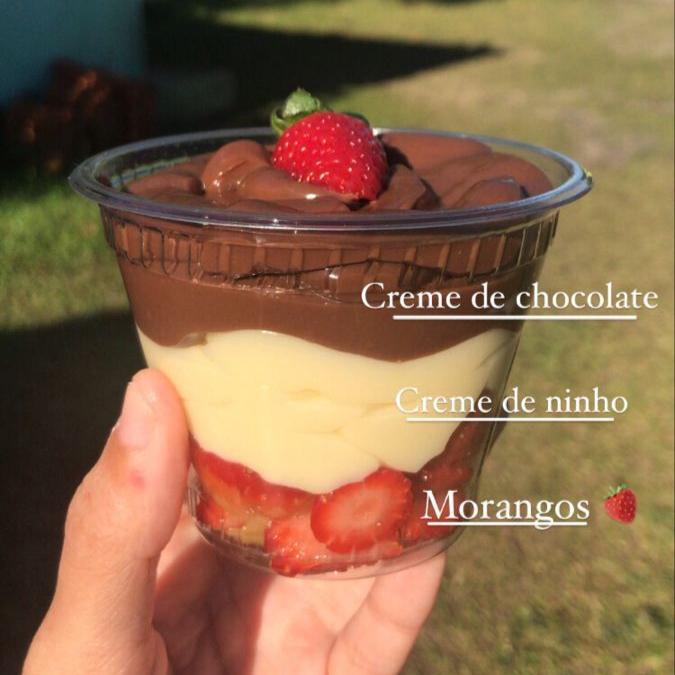 Sobremesa em camadas que conquista na primeira colher: morangos frescos e suculentos na base, creme de ninho super cremoso no meio e uma generosa camada de creme de chocolate por cima, finalizada com morango inteiro. Doce na medida certa, cremosa e refrescante — perfeita para matar a vontade de chocolate com fruta. Ideal para consumir geladinha!