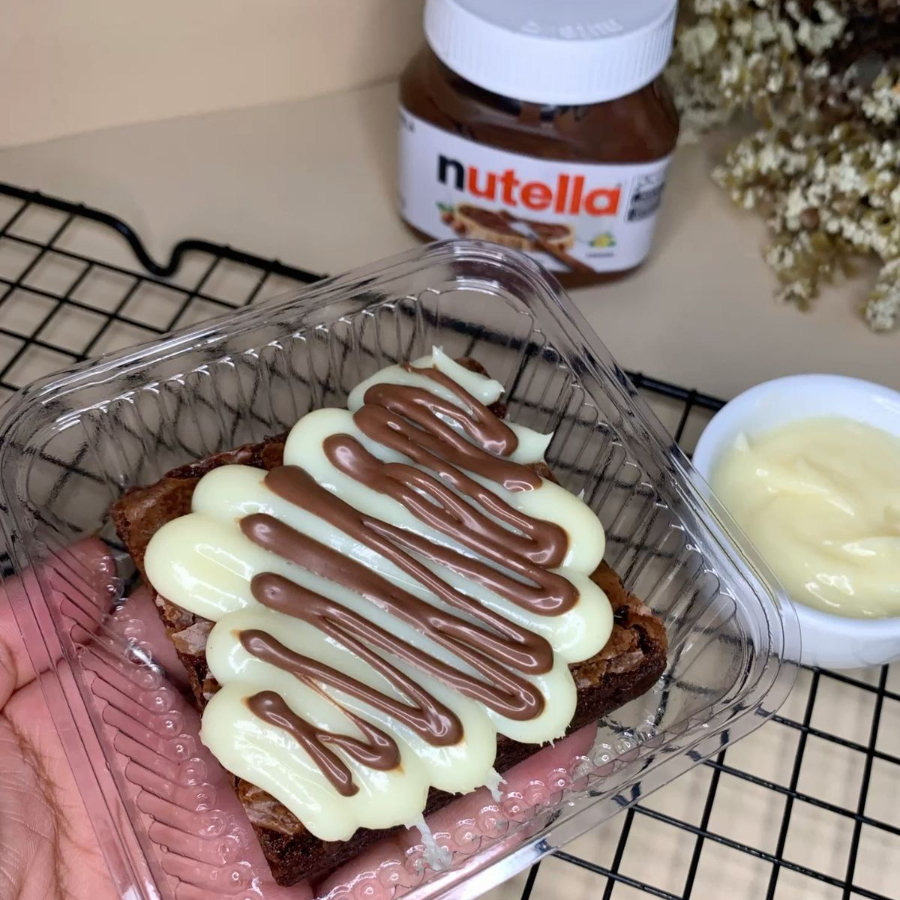 Brownie artesanal super chocolatudo, com massa bem úmida e intensa, coberto com uma camada generosa de creme de Ninho e finalizado com uma calda de Nutella por cima, deixando tudo ainda mais cremoso e irresistível.
