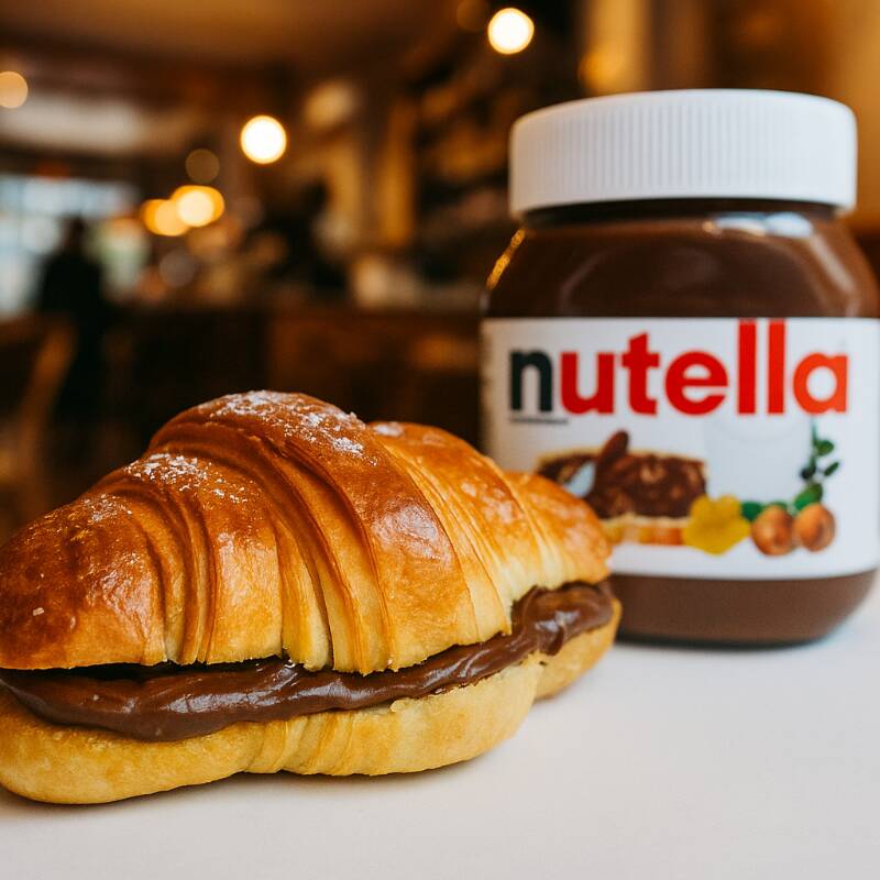 Delicioso croissant amanteigado, meticulosamente recheado com a indulgente Nutella! Esta é a sobremesa perfeita para satisfazer suas vontades doces, ou o acompanhamento ideal para realçar o sabor do seu cafézinho. Desfrute da crocância perfeita da massa, que revela um interior macio e generosamente recheado, entregando uma experiência gustativa inigualável. É o encontro harmonioso entre a tradicional receita francesa do croissant e o irresistível sabor do creme de avelã italiano Nutella.