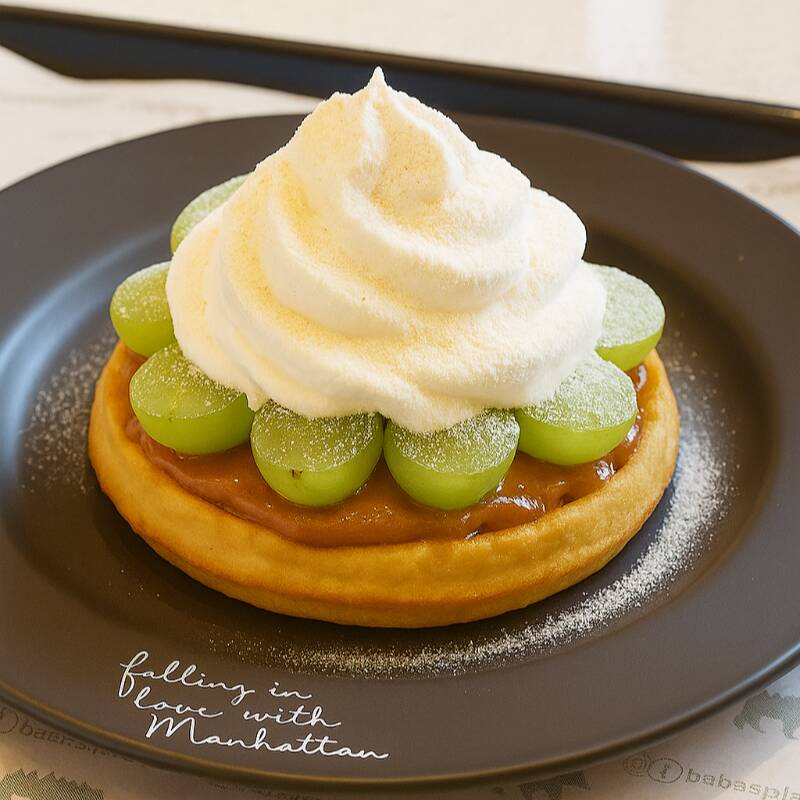 Waffle, Doce de Leite, Uvas, Chantilly e Leite em Pó