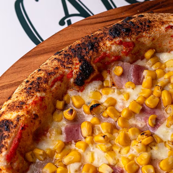 Molho de tomate italiano, muçarela, Catupiry, bacon artesanal e milho.
