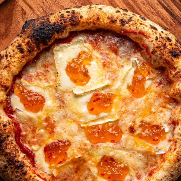Molho de tomate italiano, muçarela, queijo brie e geléia de pimenta.