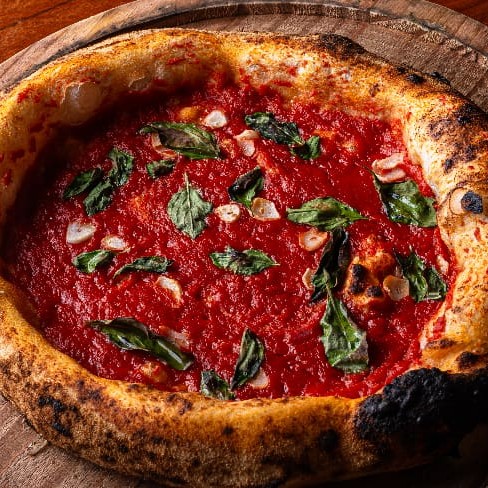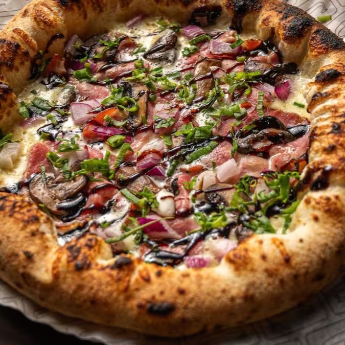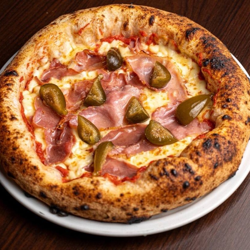 Considerada a 8ª melhor pizza do Brasil em 2025) - molho de tomate italiano, muçarela, parmesão e pancetta artesanal defumada. Finalizada com um toque de geléia de alho negro, hortelã e pistache torrado
