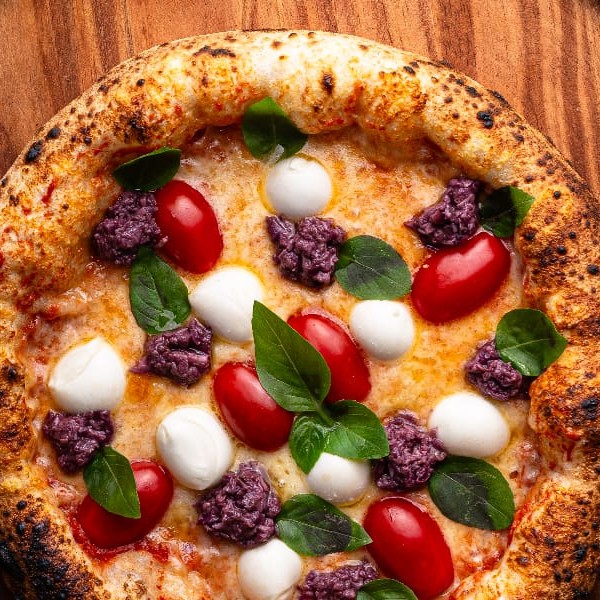 Molho de tomate italiano, búfala, tomate sweet grape, pesto de azeitona preta e manjericão.
