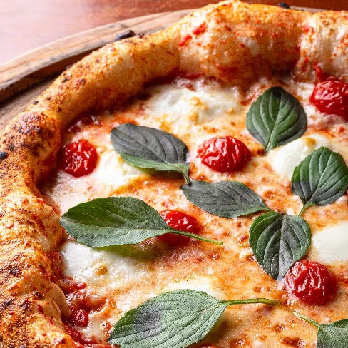 Molho de tomate italiano, muçarela, muçarela de búfala, tomate sweet grape e manjericão.