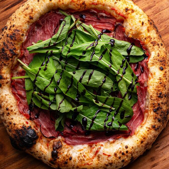 Molho de tomate italiano, muçarela, Catupiry, pastrami, rúcula e creme de balsâmico.
