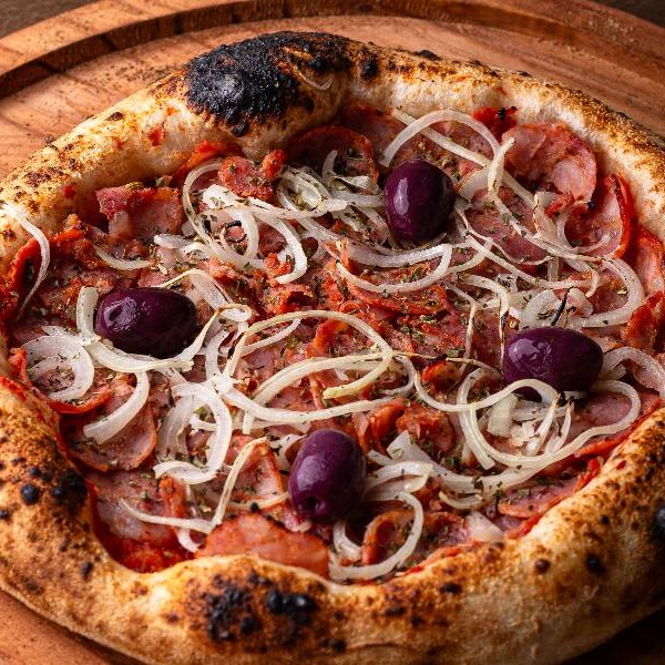 Molho de tomate italiano, calabresa artesanal levemente picante, cebola, azeitona preta e orégano