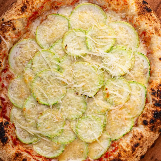 Molho de tomate italiano, muçarela, abobrinha e parmesão. Pizzas individuais com diâmetro de 26cm