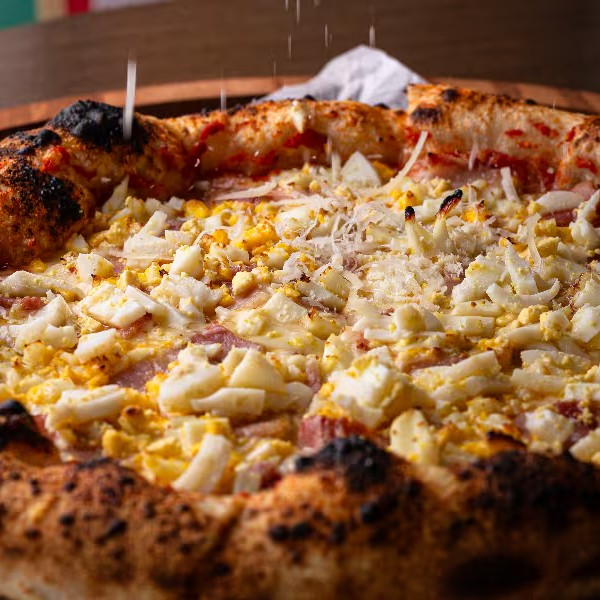 Molho de tomate italiano, muçarela, bacon artesanal, ovo e queijo parmesão.