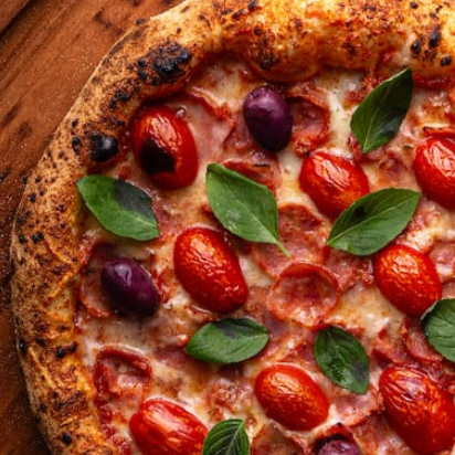 Molho de tomate italiano, base levinha de parmesão e muçarela, calabresa artesanal levemente picante, tomate sweet grape, manjericão e azeitona preta. Pizzas individuais com diâmetro de 26cm