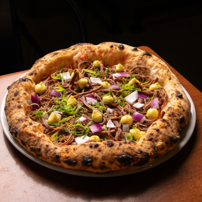 Molho de tomate italiano, muçarela, brisket, cebola roxa, cebolinha e creme de mostarda.
