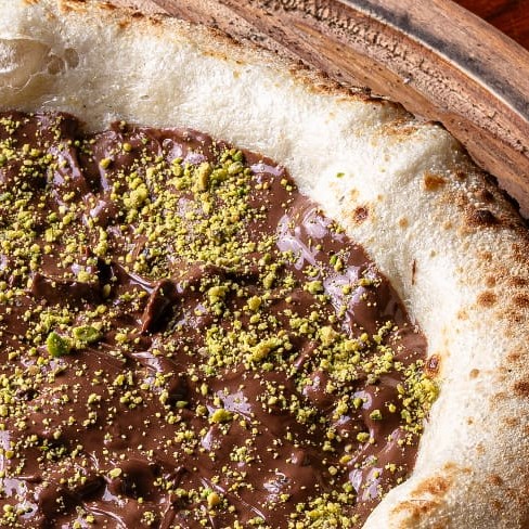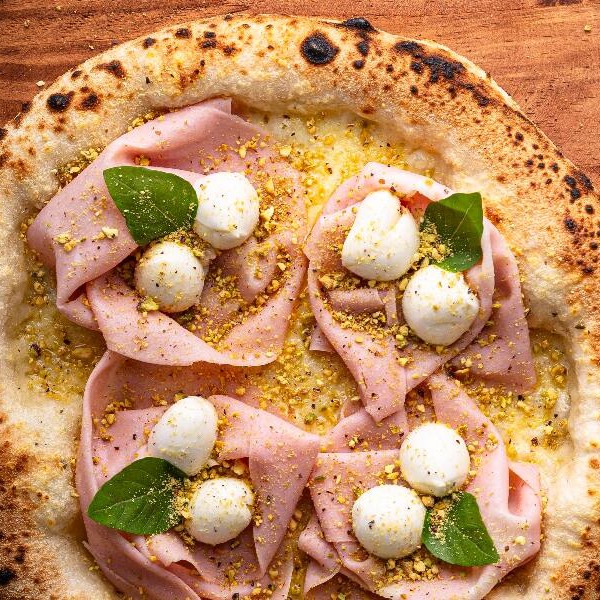 Muçarela, mortadela italiana, búfala, pistache e manjericão.