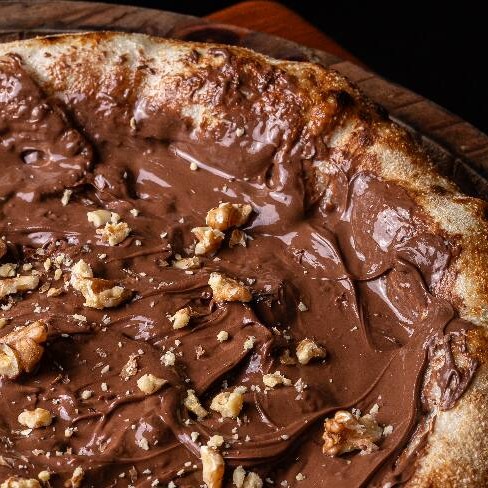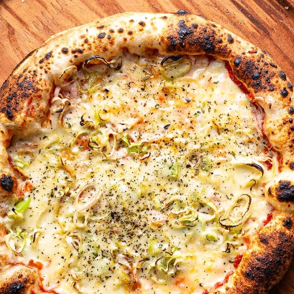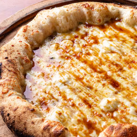Pizza Bianca (seem molho), Melaço de cana, muçarela, gorgonzola e muçarela de búfala. Pizzas individuais com diâmetro de 26cm