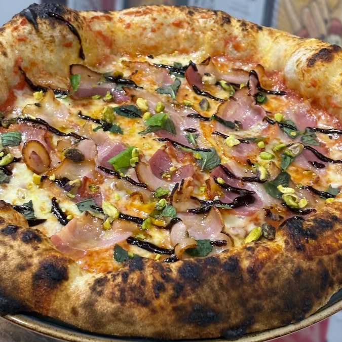 Considerada a 8ª melhor pizza do Brasil em 2025) - molho de tomate italiano, muçarela, parmesão e pancetta artesanal defumada. Finalizada com um toque de geléia de alho negro, hortelã e pistache torrado