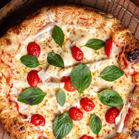 Molho de tomate italiano, palmito, muçarela, tomate Sweet grape e manjericão.