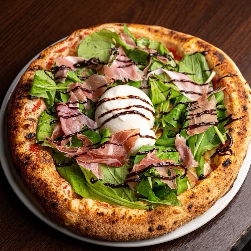 Molho de tomate italiano, muçarela, rúcula, burrata, parma e geléia de alho negro.